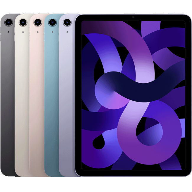 The iPad Air 5th Gen (Wi-Fi + Cellular) features a fully-laminated, antireflective 10.9" LED-backlit 2360x1640 "Liquid Retina" display (264 ppi, 500 nits) surrounded by a thin black bezel and and packed in a thin case with rounded corners and flat sides. The back is one of five metallic color options -- dark "Space Gray", a warm gray "Starlight", Pink, Purple, or Blue.